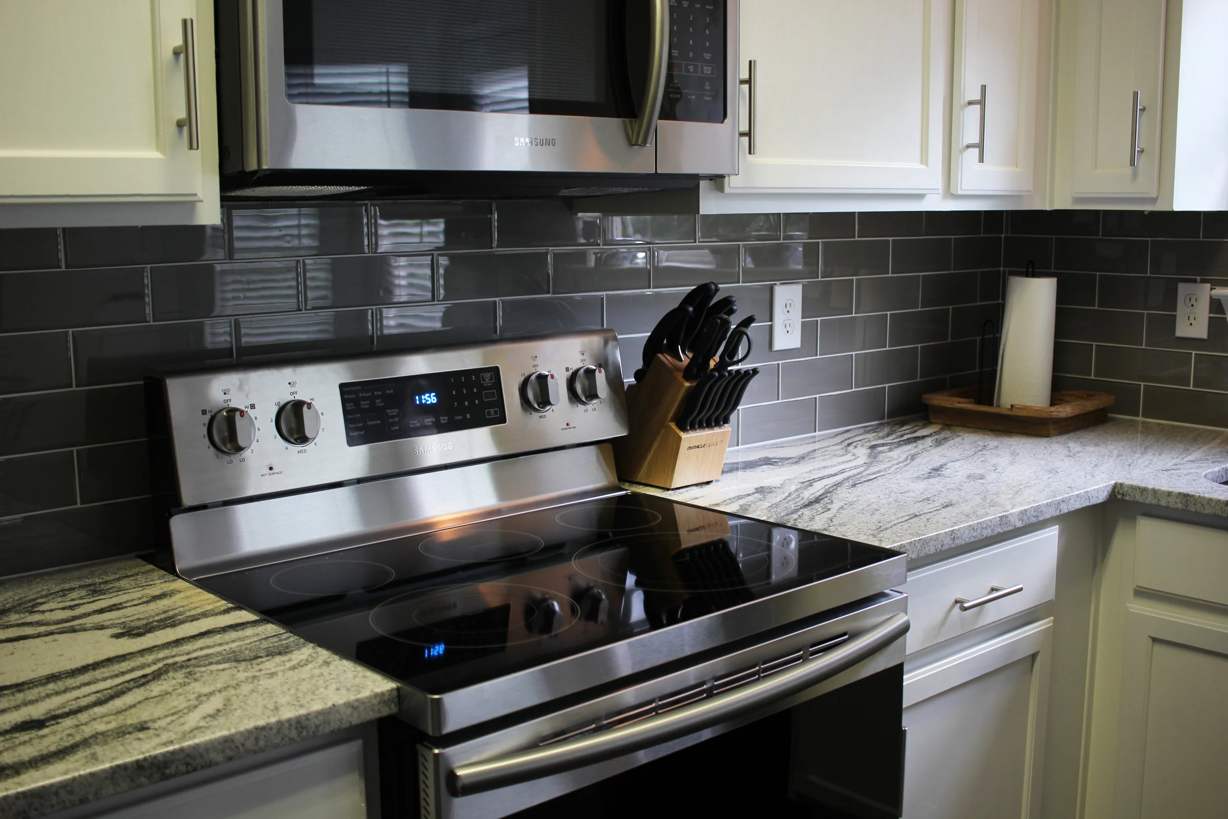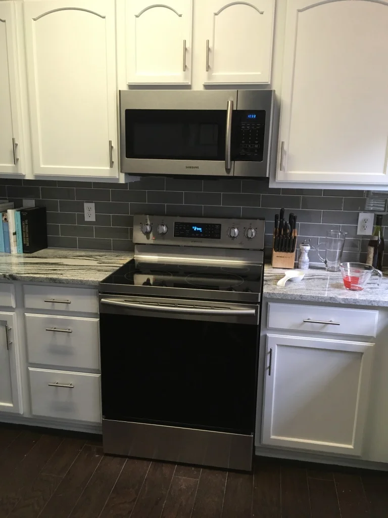 We were originally going to wait a bit to replace appliances, but with all the times we were in Home Depot during this kitchen update, we noticed an amazing sale we couldn't pass up. Plus, both of us were sick to death of trying to clean the stupid coils on our old stove, and our microwave had been missing its plate since we moved in.