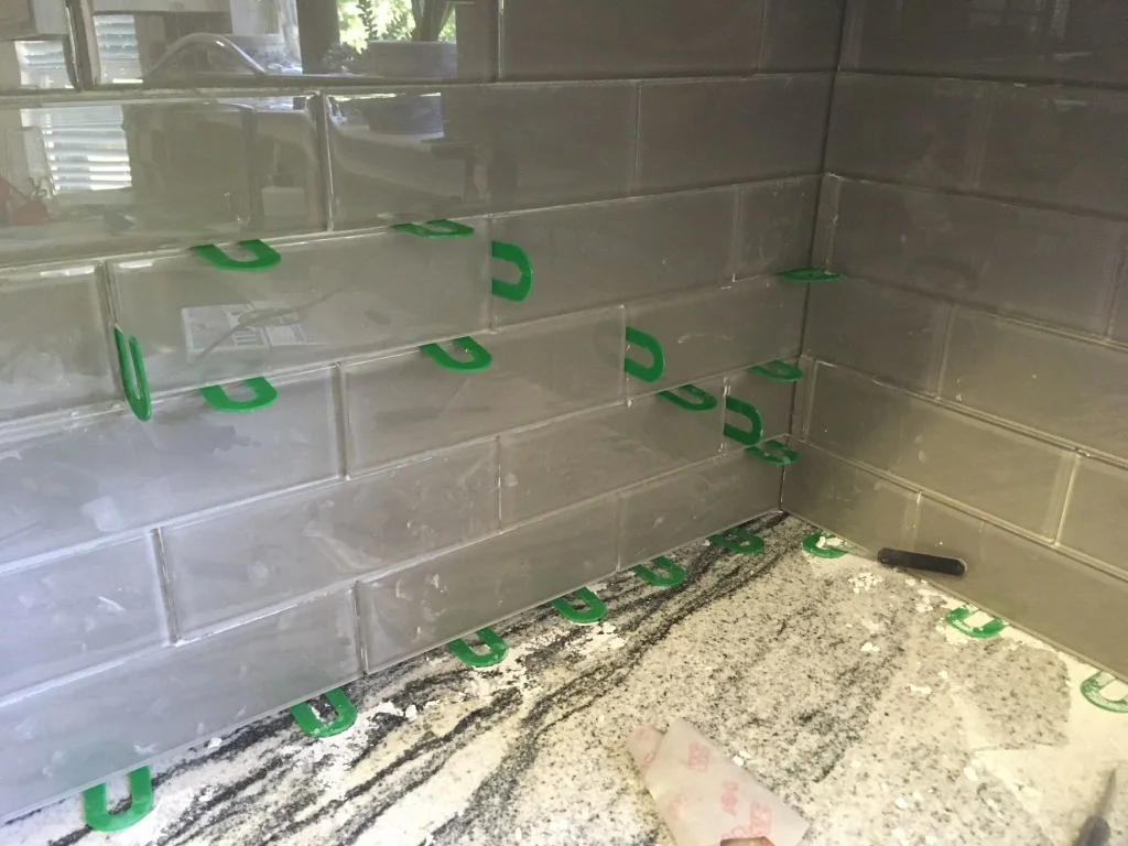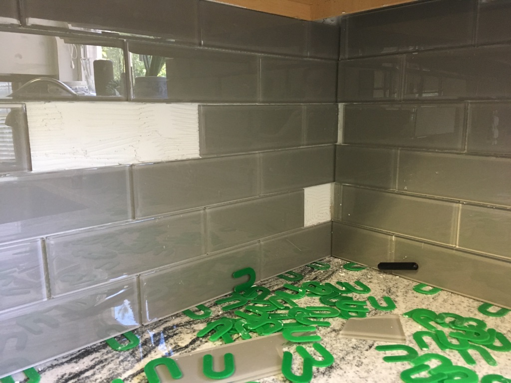And that was the end of the problems, right? Wrong again. Towards the end of the wall, we probably should have remixed the mortar, but we pushed through. And two days later, when we took out the spacers, there were a few casualties. RIP. Thankfully, none of the tile actually broke, so we didn't have to cut any new ones. But I DID have to spend the better part of an hour grinding the dried mortar off the wall and applying tile repair mortar.