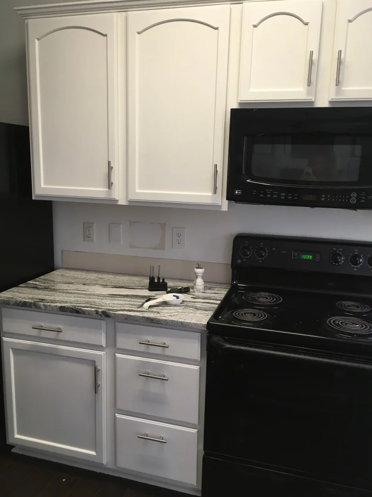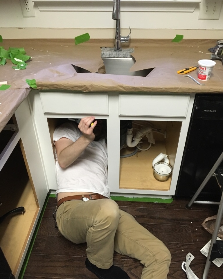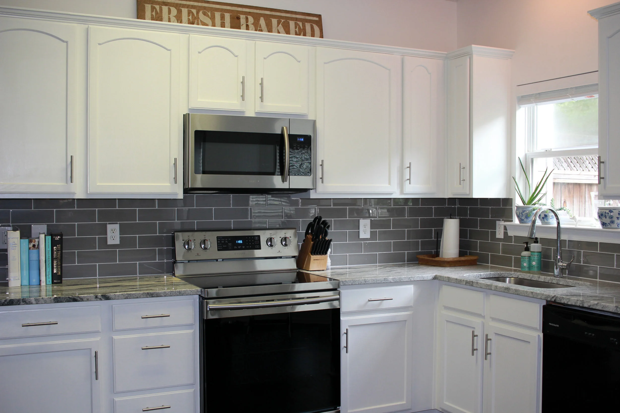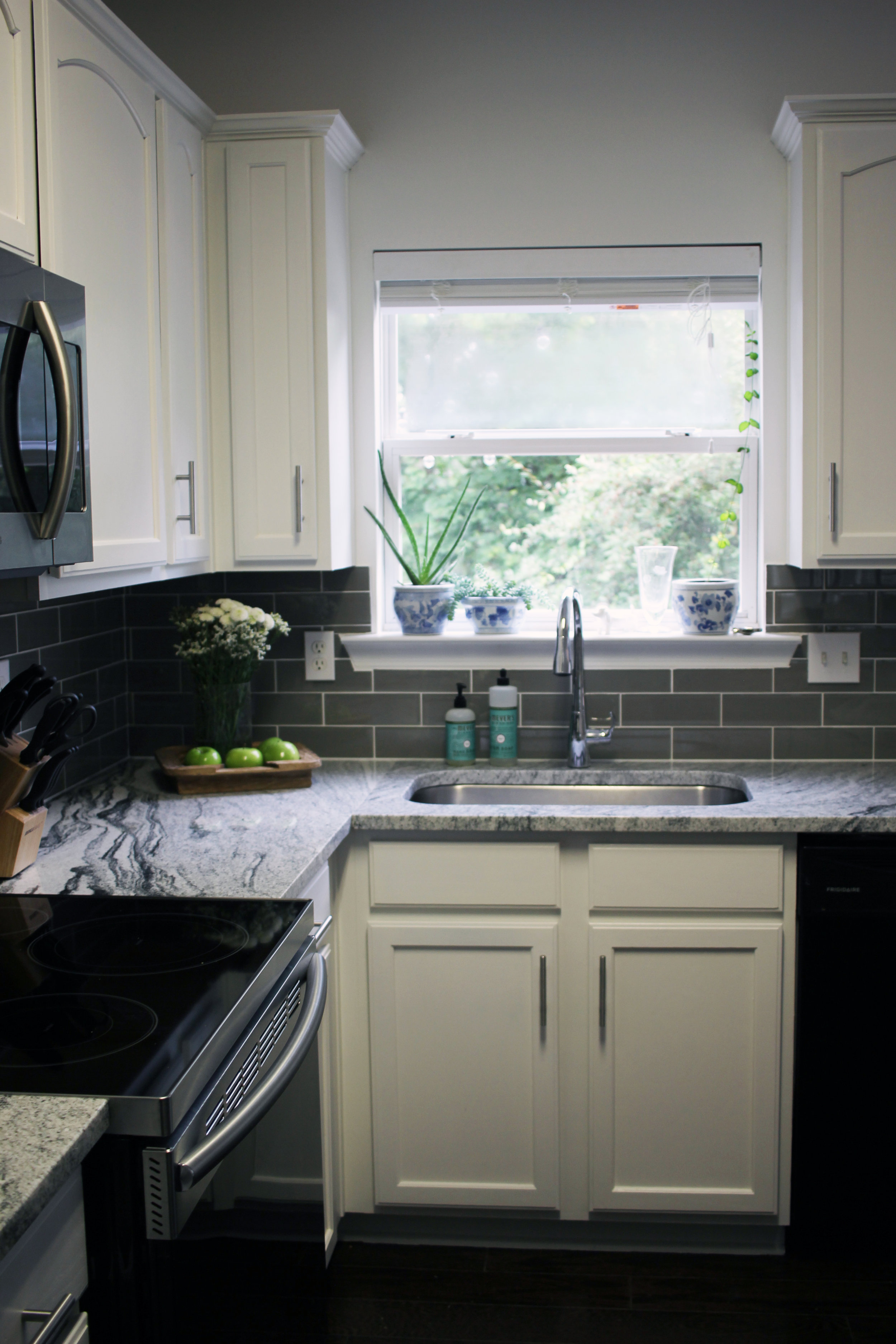Instead of $17,000, we put in a lot of work and spent just $2,125! (And only $2,900 with upgraded appliances!) A tiny fraction of the price and I got every single thing I wanted. When it was all said and done, we had replaced the countertops, installed a new sink and faucet, painted the cabinets, replaced all the hardware, put up a new backsplash, and replaced the stove and microwave. It took us roughly two weeks, but that included a few days of wait time for the appliances and a few days that we were out of town for a wedding and busy with other things. If we had nothing going on and had planned a project timeline in advance, we probably could have done it all in a week. But why rush? Who needs a functioning kitchen and working plumbing when there's Chinese takeout to be had?