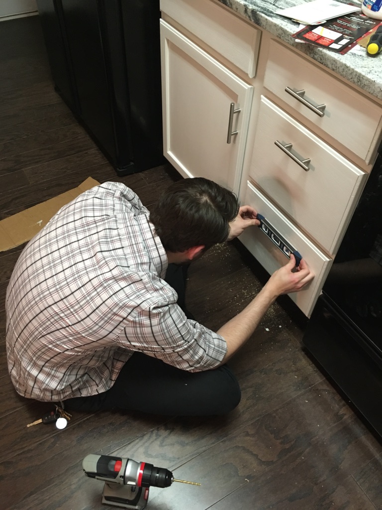 What was the problem, you ask? It was a door handle. A noticeably not-level door handle. To me, someone who had just spent the last week of her life working strenuously on painting the cabinets perfectly, the idea of having to plug yet another unwanted hole, sand it down, and then prime, paint, and seal all over again was just enough to make my voice do the shrill wife thing and my eyeballs come as close as possible to popping right out of their proper holes. But, good husband that I have, J sat me down in front of an episode of Elementary and set to work fixing it, no wood filler or repainting required. Crisis averted.