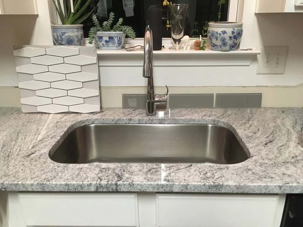 When we went to Floor & Decor to pick out our tile, we fell in love with the gray subway tile in a shower display. Neither of us originally wanted subway tile, but the gray color and shine from the glass made it stand out, and we liked how it brought together the white cabinets and the granite.