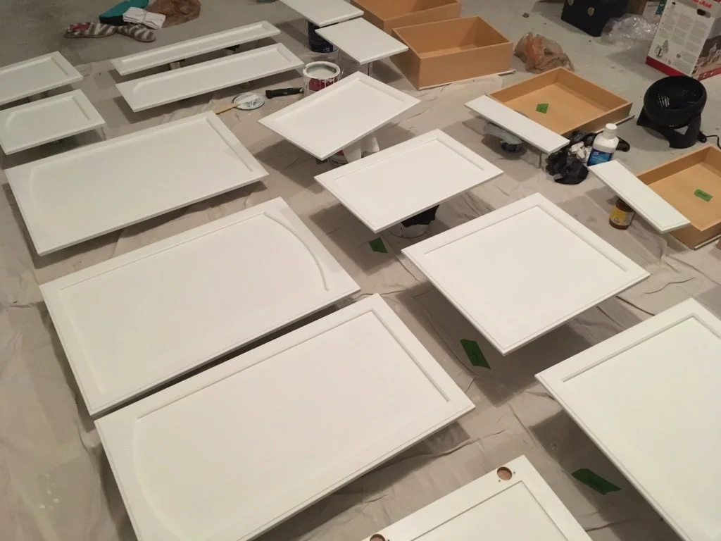 I set up a work area in the garage and moved all the doors and drawers out there. I cleaned each one, scraped off the old bumpers, sanded, deglossed, and then laid them on a drop cloth on top of their label. Instead of buying painter's triangles, I took the money-saving route and used canned food covered in dish towels. The cans lifted the cabinet doors of the floor so I could paint the edges, and the towels kept the cans from leaving marks on the dried paint job. Starting with the back sides, each piece got two coats of primer (front and back), three coats of paint, and three coats of sealer. We used leftover paint from when we moved in, and since we were saving so much by doing the painting myself, I felt better about getting a more expensive sealer. I went with this recommendation from one of the tutorials I read; it has great reviews and since these cabinets get a lot of use, I felt it was worth the extra price for extra protection.