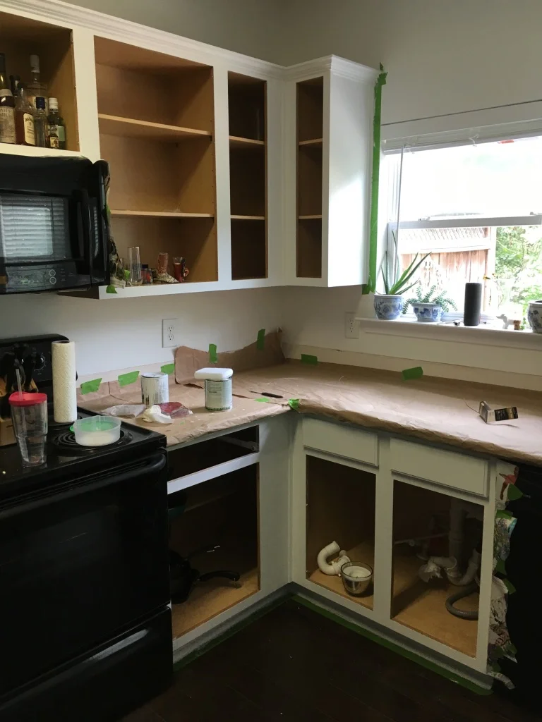 Back inside, I emptied the contents of our cabinets into the living room. After the countertops were removed and replaced, I covered them with paper to protect from drips and got to work on the boxes.